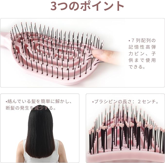 • 7列の形状記憶能力を持つブラシピンが、絡んでいる髪を簡単に解し、断髪しにくい。